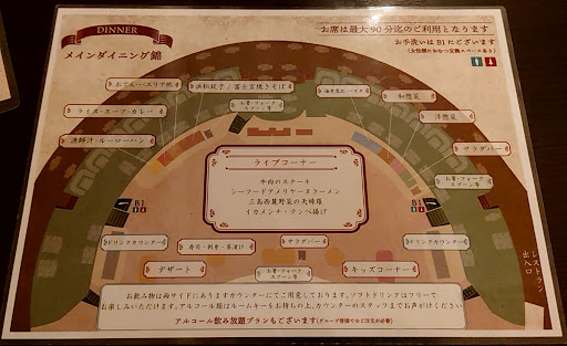 ビュッフェコーナーは写真の通りマッピングされており、何処に行けば何があるかが分かるようになっています。中央のシェフコーナーでは焼きたての牛肉ステーキが振舞われておりました。