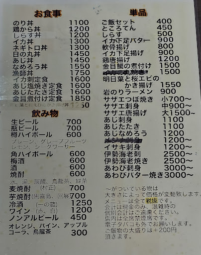 やっと涼しくなり、前々から来てみたかった初島へ本州を久々に離れ来島してみました。 島の散歩・散策も楽しみにしていましたが、周りが全部海ということは勿論『海の幸』を最も連れと楽しみにしていました。 何店舗もお店がありましたが、このお店が空いててすぐに入れたのでここに入りました。 先ずは🍺ビールで喉を潤して、摘みにサザエの壺焼き(中)を頼みました。ホントに昼で品切れなのか、いつもそう言ってるのかは分かりませんが、もう大しかないと言われ、それを一つ頼みました。しかしながら…出てきた壺焼きは刺身用のサザエに醤油掛けて焼いただけの素人張りの料理でした…。涙 酒と醤油やみりんの味はせず、醤油のみ、にがっ!それに楽しみの一つの肝は入っていませんでした…。ひどい。壺焼きに肝なきゃ最初から頼みませんから~。嫌いな方もいますけど、付いていて当たり前なはず。ぼったくりです 気を取り直して食事に海鮮丼と生物苦手な連れは唐揚げ定食を頼みました。おじさん独りで調理してるらしく出てくるのに40分以上かかりました。やっと♪きたーと腹空かしてた私は早速食べようとしたら??…ん?すみませーん、海鮮丼頼んだんですけど~と当然定員さん(娘なのか態度の悪いお姉さん)に違う物がきた旨を伝えました。そしたらガッとお盆ごと日の丸丼とやらを引き取り、厨房の方でこちらに聞こえるように海鮮丼なんだってよーー。とさもこちらが悪いみたいな口調で話してました。腹は減ってるわ、待たされるわ、悪者にされるわで二度とこんな店に来るかと思いながら海鮮丼食べたので、全く美味しくもなかったです。 勿論、唐揚げ定食も値段の割に小ぶりで少なく散々待たされたのに大した物ではなかったとのこと。あれ、自分が?連れに海鮮丼と言ってたか確認しても海鮮丼と言ってたよと確認もとれました。あ~腹立たしい… 海鮮丼、唐揚げ定食、ビール×2、サザエの壺焼きこれだけでお会計は1万円。間違った分も入れたのか?と聞きたいくらいでした。ぼったくりです。レシートも詳細も分からず。 あのねーさんも気分悪い雰囲気かもし出して働いているし、もう二度とここに来ることはない...