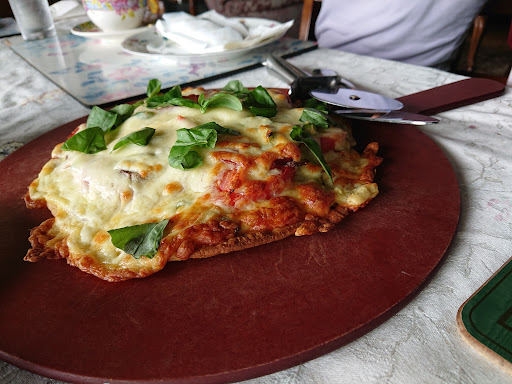 店内…というより室内の居心地の良さそうな椅子に腰かける。 予め調べておいたメニューからピザと飲物、食後にアップルパイをお願いしようと決めていた。 友人が「ピザふたつと…」という言葉に被せるような早さで「ピザ二つは量が多すぎるからひとつを半分こしなさい」 そして「アップルパイが自慢なの。入らなくなるわよ」と。