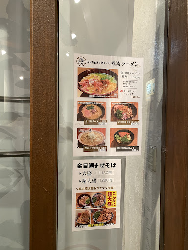 Read more【来店日】2023/02/22 【注文】 金目鯛ラーメン 【駐車場】 周辺に有料パーキング有り(¥100/60分) 【メニュー】3/5 金目鯛ラーメン極み/金目鯛まぜそば/金目鯛ラーメン が基本のメニューです。まぜそばのみ大盛り超大盛りがあります。 【店内】5/5 店内は清潔に保たれています。店内全体がおそらく金目鯛の出汁の匂いがしてとても食欲が湧きます。 【接客】 調理担当の男性と女性の2名 【待ち時間】3/5 17:30頃にお伺いしたのですが、20〜30分ほどの待ち時間です。客席は、MAX9人です。観光で来られた方が多いのか、とてもゆっくりと召し上がられる方が多い印象です。 食券は先でも後でも大丈夫だそうです。 【調味料】2/5 卓上調味料は白胡椒と黒胡椒(あらびき)のみです。 【麺】3/5 混ぜそばは太麺、 金目鯛ラーメンは細麺でした。私の後に来た人たちは細麺が無くなってしまったようで、金目鯛ラーメンを太麺で提供しても良いか聞かれていました。 圧倒的太麺派ですが、ここの細麺は硬くもなく柔らかくもなくちょうどいいと思います。 【スープ】3/5 魚介ベースで、めちゃくちゃ魚介です。塩味が強いと言われている方もいますが、個人的には魚介の風味の方が圧倒的強いと感じました。 ただ一口飲んだ時、油が口の中にまとわりつくのを感じました。もっと油が少なく、あっさりしていても良いのかも。 トッピングに紫玉ねぎがのっていたのですが、玉ねぎ臭さが結構強かったです。私は好きなのですが、好きでない方だと気になると思います。 チャーシューはスモークのようで、薄いですがしっかりとした食べ応えで肉肉しいです。