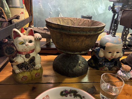 連れて来られたので退店することもできず食事をしたが、テーブルには大きめのオブジェが所狭しと置かれ、片眼のない招き猫の至近処理での食事はまるで(私が生まれる前の時代の)物置小屋でするようで、食事が喉を通らなかった。