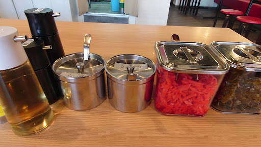早速、麺を投入し、どこぞのチェーン店みたくチャーシューを盛った後に、気になっていた備え付けの辛味をセンターにタップリと投入してみたら('-' ).........。