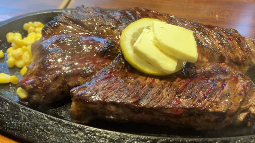 メニューを見ると、HPの共通メニューやこの口コミのメニュー写真ともまた違ってアップデートされている模様。 詳しいメニュー名は忘れたが、アンガス牛のステーキ・500gのCセットとバターコーン?とドリンクバーを注文。 焼き加減はミディアムレア。 当初は400gじゃあイマイチ足りないし800gは多すぎるしくいしんぼステーキの200×3は何かチガウ…と思っていたので、ネットには出ていなかったこのサイズが正にピッタリ。