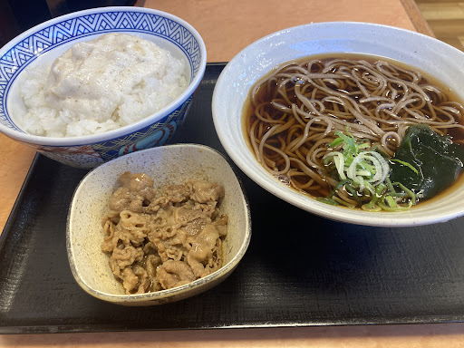 Read more再訪(朝食はお得感満載で⭐︎3から⭐︎4に変更) 念願の朝食メニューです。 写真のものは「朝蕎麦とろろご飯牛小鉢」のライス大盛り(無料)です。 蕎麦の感想は前と同じ。フードコートで食べる蕎麦のようで、それ目当てに食べに行くほどではないけれど、セットの中の一品としては、十分。ご飯大盛りは、単品メニューの丼物の大盛りなので、大盛りにしたい方は2人前食べるつもりで注文した方がいいかもしれません。 牛小鉢を丼にもれば普通に「とろろ牛丼の大盛り」です。