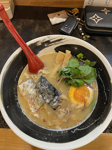 オーダーは「インスタ映え間違いなし」という『黒海』。 黒海は「こってり」のさばラーメンで、鯖を存分に活かした一杯。スープは濃厚で、鯖節を中心に旨味がグッと押してきて、魚粉のザラッとした舌触りもほんのりあり。 香りや脂感はしっかりあるけど、生臭さや小骨は排除されていて、鯖好きだけでなく魚介系ラーメン初心者にも安心なバランス。 麺は全粒粉入りの中太ちぢれ麺を使っていて、もちもち感とスープの絡み具合がなかなかのもの。 具としては、鯖の煮付け半身、水菜、味玉半分、極太メンマなどオーソドックスな構成だけど、魚の旨味を引き立てるための構成になってる。 特に鯖半身がビジュアル的にも満足感が高い。