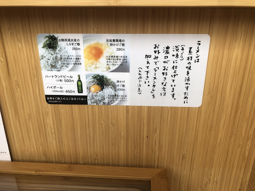 メインメニューは醤油ラーメンとチャーシュー麺のみで、サイドメニューはシラス飯なとご飯系が少しあります。なので、醤油ラーメン嫌いな方にはおすすめ出来ませんね