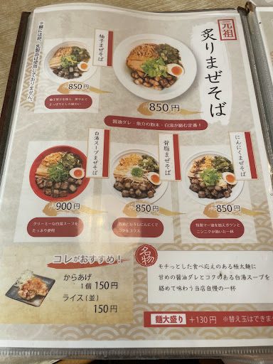 あっさりラーメン系、こってりラーメン系、まぜそば系、その他とメニューはいくつかの系統に分かれていますが、僕はまぜそば系を食べることが多いです。坂井市あわら市近辺ではまぜそば系を出すところは少ないからです。この日は「にんにくまぜそば」。連れは「鶏白湯まぜそば」を注文。にんにくは来た瞬間強烈なにんにく臭が。品名に偽りなし、好きな人にはたまりません。具や味の方も、少し濃いめなのが好みが分かれそうですが、全体的に上手くまとめられています。鶏白湯の方も濃厚でまろやかな感じで美味しかったです(この後2日間にんにく臭が抜けませんでした…強烈。)。グリーンカレーそばというのがあり、なかなかの完成度、オススメです。餃子や唐揚げなどサイドメニューもありますよ。