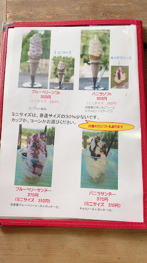 Read moreまず、喫茶店があります。入り口ではりんごや柿などのフルーツも販売しています。夏場にはブルーベリーなどの販売もしているようです。また、山羊や猫などの動物もおり、山羊、羊、うさぎにはエサを与えることもできます。 喫茶店とは別に、ブルーベリーパイやパウンドケーキなど、テイクアウトの商品も販売しており、ブルーベリー、いちちじく等のジャムや、ブラックベリーなどのソース、ジュースも販売しています。喫茶店のメニューでは軽食や、サンデー、アイスなどがあります。ハーブティー、コーヒー、ブルーベリーや、りんごなどのフレッシュジュースもあるようです。ブルーベリーサンデーや、バニラアイス、コーヒーをいただきましたが、特にブルーベリーサンデーは、ブルーベ...