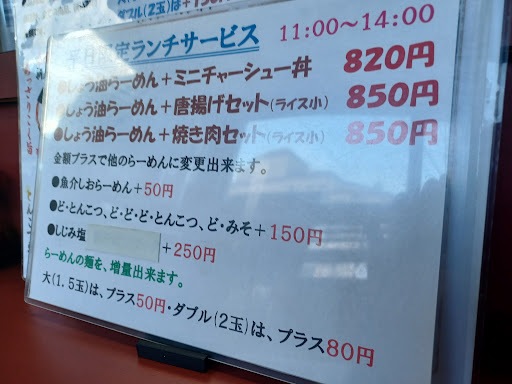Read more平日のランチタイムはセットメニューがお得となっています。私は醤油ラーメン😚🍜(魚介のスープ)に焼肉のセットメニュー(ライス小が付く)を注文しました。ラーメンは魚介が味わえるあっさりしたスープのラーメンでした。また、セットの焼肉も私的には美味しかったです。次回以降には味噌ラーメン、塩ラーメン、豚骨ラーメンを頂こうと思っています。また、チャーシュー丼、唐揚げ等もあり食べてみたいです。 今回は魚介 シジミ...