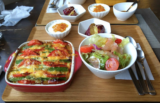 焼きカレーは、トマトとアスパラで彩りが良く、サイズ感もちょうど良い❤️ コッテリかと思いきや、優しい味付けですよ❤️ あとあと、小鉢も嬉しいですよね〜✨
