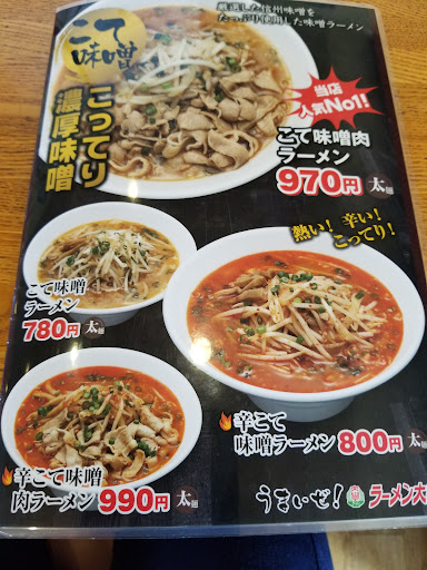 通勤途中にあるので、とても気になっていたラーメン大学です。休日のお昼に行ってみました。 ご夫婦と息子さんで営まれているお店でとても好感が持てました。画像にも載せましたがメニューが豊富です。ただ単にメニューが多いのではなく、お客さんの好みを考えながらメニューを考えていると感じました。ラーメン以外の定食もあり、家族やグループで行っても必ず食べたいメニューが見つかると思います。 ラーメン大学といえば味噌だと思いますが、今回私は穂高店の人気ナンバーワンの肉こて味噌ラーメンをいただきました。期待通りの太麺で味噌にコクがあり、食べごたえがありました。カウンター、テーブル席があり、カウンター後ろには雑誌やマンガも置いてあり、一人でも充分楽しめる空間になっています。アルコール類やおつまみも結構あるよくなので、飲まない人が一人以上いれば、夕飯を兼ねてラーメン以外のおつまみ(餃子を含む)とアルコール、ソフトドリンクとおしゃべりを楽しみながら、しめ、またはメインディッシュとしてお好みのラーメンを堪能すれば満足なディナータイム間違いなしと思います。私は個人的にリピー...