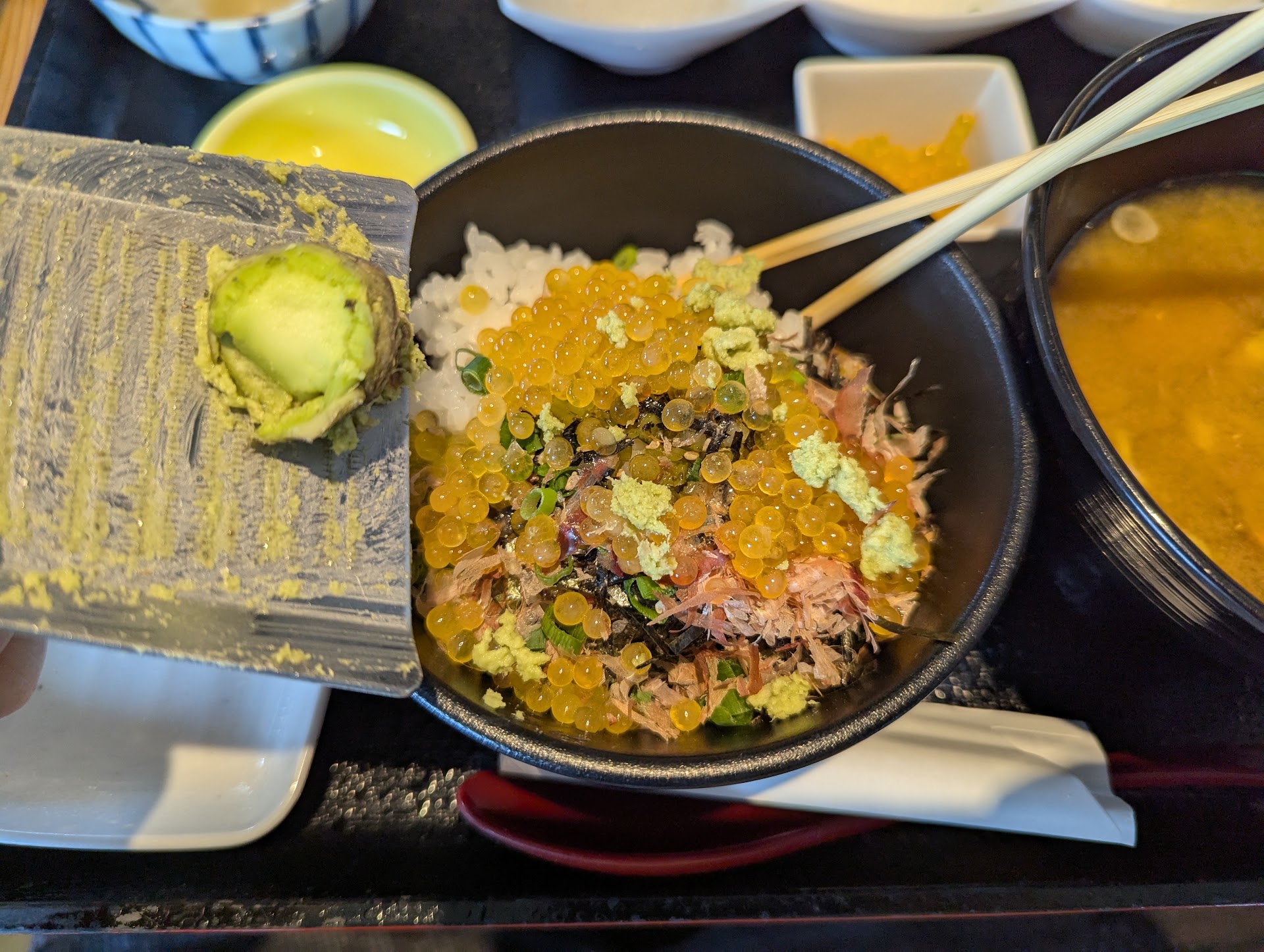 Getting real wasabi in the US is hard, and expensive. At least in the South where I am. Getting to grate a huge chunk of wasabi over a rice bowl and with sashimi was a huge treat.