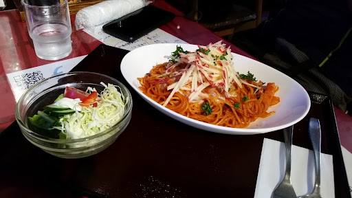 安曇野のシンボル常念岳に登った帰りのお昼閉店間際に訪れました。外観は気取らない素朴な造りの為か食事処に見えず、Googleでお店を探すまで知らずにいました。料理を準備する時間もあると思い閉店間際でも大丈夫か訪ねると、笑顔で大丈夫ですよと迎え入れてくれました。店内は他の方のレビューにもあるようにテーブル席近くには大きな水槽が何個もあって、熱帯魚から中型の海水魚が泳いでいます。お座敷もあってカップルから家族連れの人まで気楽に来れそうな雰囲気です。コミックや雑誌も数多く置いてあって思わず長居してしまいそう。肝心の料理はメニューが多いので何を注文するかとても悩みました。結局私は鶏肉とご飯ものが好きなのでチキンカチャトラ定食を、県外から来た友人は地元で話題になっている安曇野林檎パスタをオーダー。アルバイト?のスタッフの方が笑顔で運んで来てくれたのでそれだけで気分が晴れる。いただいてみるまでパスタに林檎が合うか半信半疑でしたが、甘めのソースに酸味のある林檎がマッチして新しい美味しさを発見した感じです。定食はジューシーなチキンに旨味の効いたソースが絡み合ってご飯が進みました。さらにご飯は普通盛りでもファミレスの大盛りくらい。(ライスの量は減らせば50~100円減額してくれます)ふっくらモチモチに炊き上がったライスが美味しかったので大盛りにすれば良かったです。今回初めて訪れたお店ですが、豊富なメニューと美味しい料理でもてなしてくれるのでファンになりました。今度は家族で...