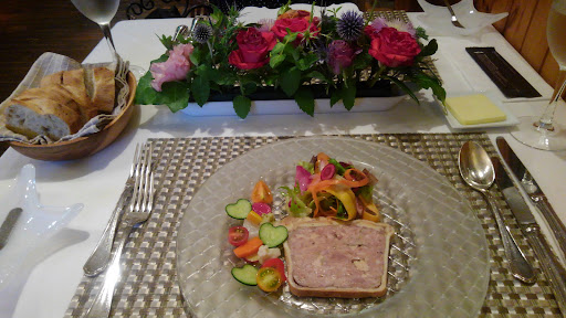 今回いただいたのは、昼の3300円(税込み)(現在はこの投稿から3年経ち、2024年現在のランチ価格は4000円となっています)のコースで、前菜の鹿とフォアグラのテリーヌは実に味わい深く、メインの魚料理は、味はもちろん盛り付けの美しさに、フランス料理を食べているという満足感をしっかり満たしていただきました。このコースには、スープ、自家製パン、デザート、お茶も含まれますが、デザートのクリームブリュレはとても大きく、お腹一杯になりました。