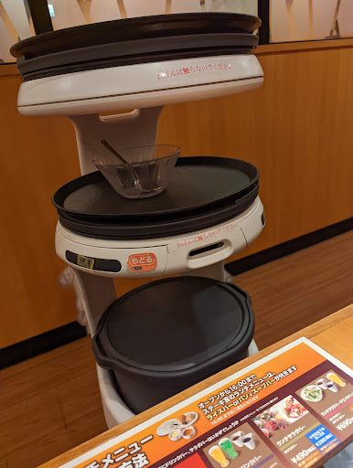 Read more久しぶりに来店してみたら… ロボットが働いていた! お冷やサラダバーのお皿を運んできてくれて… センサーで人や物にぶつからないようにできていて、他の人間の店員さんやお客さんと出会い頭にぶつかることもなくせっせと働いていた!