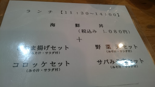 Read more土曜日のランチタイムに訪問。 ランチタイムはランチメニューしか選べない様なので、海鮮丼を野菜天セットでオーダー。 アサリのみそ汁とサラダが付いてた。 海鮮丼は高級なネタが入ってるわけではないが、お値段税込¥1080はお得だと思う。 ボリュームもなかなかだった。 今度はディナータイムにも訪問してみたい。 喫煙可のよ...