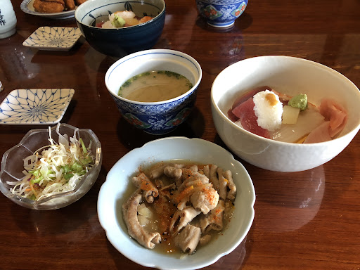 Read more毎日、ランチの海鮮丼の食材が違うみたいです。なので、楽しめます!味も美味しいです!海鮮丼+豚の生姜焼きやおでん、もつ煮等から選べるんですが、それも美味しいですよ。にんにく味噌?が乗っかってる握り飯をサービスでもらえました。それも美味しい(^-^)/ランチなら1,1...