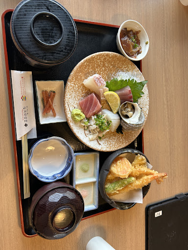 A great meal overlooking the ocean. We can’t figure out why Beppu doesn’t have more Oceanside/oceanview restaurants🤷♀️. Found this one in a marina. Sashimi set meal was great and my kids loved the tempura. Portions were quite large and my husband and I tried to share which complicated the drink situation… there is a self serve drink bar with coffee, soft drinks and water but in order to get it “free” each person has to order a meal over 1,100 yen… our bill for 3 people was 5500, but when we tried to get drinks the waitress got very forceful about us having to pay 440 for a 4th drink because we only ordered 3 meals plus extra rice and miso. Honestly no big deal but the kids thought she was mad and it kind of put a damper on the mood of our lunch. I totally recommend this place, just make sure everyone orders a full meal and you avoid the mix up. Also I have no idea why the waitress was constantly speaking so loudly when she was seating other tables near us. Maybe she was explaining the drink situation forcefully in Japanese before people sat down who knows. The loud constant talking/directions from live people and speakers is hard to get used to in this country but everyone must stay quiet in elevators and on the train,...