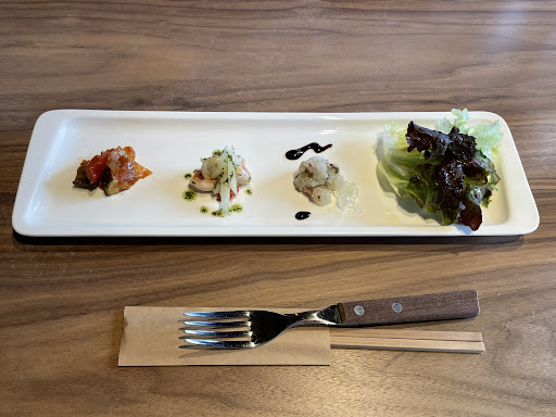 Read more前々から気になってたのですが、ようやく行く事が出来ました。 小ぢんまりとした店構えから、ここに店がある事に気が付かない人も多いのではないかと思います。 テーブル席がいくつかとカウンター席が3席 外から見たら、小さい感じですが1人でも4人でも大丈夫そうです。 私はタイとホタテのポワレ。 連れ合いは炭火焼きハンバーグと冷製コーンスープをオーダーしました。 どちらもライスと前菜付きです。 前菜のセンスある盛り付けだけで料理に期待が持てます。 食べてみて…期待通りの美味しさでした 一口サイズの前菜の並び、右から順番に食べていきました。 メインのタイとホタテのポワレ、繊細な優しい味付けに食べながら気持ちが和らぎます。 濃い味付けの多い九州のお店に日頃から苦戦している大阪出身の私には有り難いですね。 素材の味を殺さない繊細な日本人的な仕事をされていて、尚且つフレンチならではのソースを活かしたしっかりとした味わいと美しい盛り付け…良い仕事をされてます。 それでもって、ライスはお茶碗での提供。 堅苦しくなくお箸で食べられる雰囲気を演出して頂けるのはお店の優しさでしょうか? ライスはおかわりも出来るのは嬉しい誤算ですね。 接客も丁寧に対応してくれますし、厨房1人とホール1人の計2人で営業されている割には料理の提供も遅くないです。 次の来店時には鮮魚のタルタル丼を是非とも食べたいですね。 駐車場はわかりにくいですが、9台分はありますから十分駐車できます。 お子様プレートというメニューもあるので、お子様連れの方でも大丈夫ですよ。 ただお店は静かな雰囲気ですので騒ぐのは厳禁です。 雰囲気もいいし、女性同士やカップルの方にお勧め...