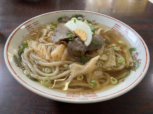 知る人ぞ知る別府冷麺の老舗。 前々から行きたいと思っていたので、ようやく念願叶っての来店です。 お店の佇まいは、家族でやってる昔ながらのお店って感じです。 お洒落な感じや、落ち着いた雰囲気を求めて来店してはいけません。 メニューは麺類以外はありません。 あ、おにぎりとご飯はあります。 来店される方の大半は、別府冷麺か温麺のどちらかの注文の様です。 早速冷麺を注文。注文と同時にご主人らしき方が機械で麺を製麺し始めました。 打ちたてっぽい感じです。 別府冷麺の基準である、小麦粉と蕎麦粉の合わさった麺は冷えたスープの中でも固すぎず、程よい固さで他の有名店よりも麺は美味しいと思います。 出汁も優しい味で結構好みの味です。 チャーシューは、別府冷麺と言えば牛肉のチャーシュー。 正直あまり好きではありませんが、薄く切ってあるので、食べれない事はありません。 豚肉ではなく、牛肉なのは何故なんでしょうね。豚肉だと冷麺の冷たい出汁で脂が固まるからでしょうか? そして、もう一つのお決まり、キャベツのキムチ。これも何故キャベツなんでしょう? これは、辛味より酸味が強くて、かなり好みが分かれるかと。 苦手かもと思われる方は、最初から一緒に入れずに別皿に盛ってもらうのもアリかも。温麺は最初から別皿で提供されてるので、初めに言えば大丈夫だと思いますよ。 総合的には、味は別府冷麺の中では、上位だと思います。 僕的には有名な2店舗より好みの味ですね。 ただカップルでランチって雰囲気のお店ではありませんので、その点は注意が必要です。 味だけを...