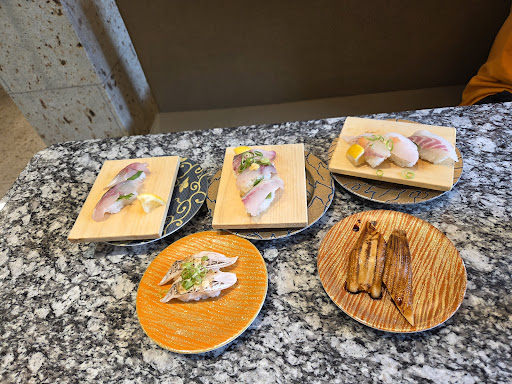 Recommended by a local we headed here for lunch. We put our name on the waitlist and waited about 15 min. We were the only Americans there and it was busy. We were seated at a table even though this is also a conveyor belt sushi restaurant. It took us a little while before we realized we had to use the button buzzer on the table to summon service(visible in the top right hand corner of my place setting picture). I had read another review that the English menu did not have the seasonal specials so using Google Translate we had the waitress order all of the seasonal specials for us. We will try anything and wanted to eat local. We were not disappointed. At the end we summoned the waitress for the bill. She used her hand held device and waived it over each of the plates we had piled at the end of the table. There's some kind of sensor on each plate that is calculated in the device. She handed us a printout and we paid the cashier as we left. Super fun experience on so...