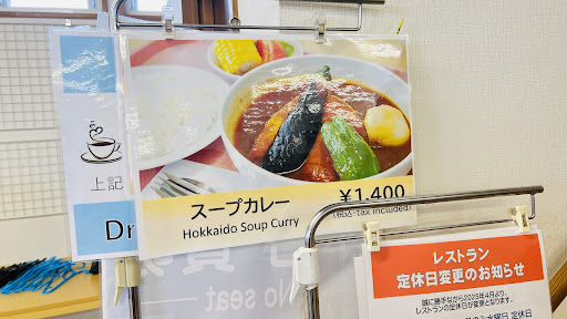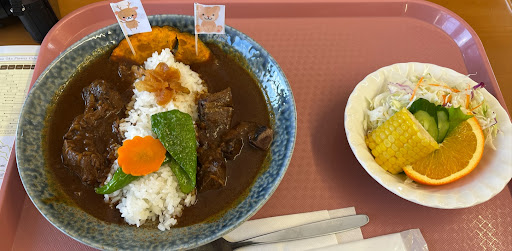 旭川周辺の登山の合間に「四季彩の丘」の花鑑賞に行った際、こちら(本館2F)に寄りました。 この時期でも多彩に綺麗に咲いている花畑に感動しそれが無料とは凄いな、と思いつつ、 駐車場500円も、レストランで500円以上使うと無料になるというおまけつき。 これは行くしかないでしょう! あまり期待せずカツカレー1000円をオーダー。 店内はこの時期三密に配慮され各テーブルには透明アクリル板で対面に配慮されています。