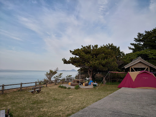 タープも持って来てましたが、 1泊なので、テントのみ張りました。 備え付けのテーブルと椅子も利用して良いとの事でしたし、近くにトイレ、コインシャワー(3分100円)もあり便利でした。 サイトから少し降りて行くと岩場で釣りも楽しめるようでした。 ただ、まだ肌寒かったのですが、 昼間が暖かいためか蚊がたくさんいて退治するのが大変でした。
