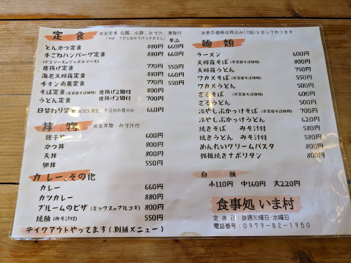 Read more土曜日のお昼に伺いました。メニューは定食、丼もの、麺類と豊富で、定食のメインは単品でも注文できます。土日祝日はサービスメニューもありました。ごはん大盛とセルフでコーヒー(1杯)が無料でうれしいですね。 注文したのはカツ丼。お味噌汁付きです。 多くのお店は丼に入っていますが、いま村さんは陶器の広めの器でカツ丼でも普通と違う趣があります。 卵とじの出汁は少なめのようで、ごはんに程よく馴染んで最後まで美味しく頂けました。カツはお肉がやや硬めに感じましたが、衣の付き具合がよくていい感じです。お味噌汁も美味しく、お店の方も感じがよくてよいランチの時間を過ごせました。 別の日に天麩羅蕎麦を注文。そばは求菩提そばでざると温かいそばから選べます。 こち...