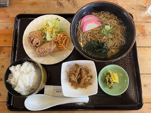 今日は豊前市にある食事処今村にお邪魔している。すぐ隣に豊前温泉天狗の湯がありお風呂上がりのお客さんで夕方は賑わってるのかもしれない。 今の時間は13時前でお店は閑散としている。営業時間は11:30〜14:00と17:30〜の2部営業となっている。 お店はご夫婦だろうか…料理を作られるご主人とフロアーは奥様で切り盛りしている。お値段が割とリーズナブルでこの辺ではお得感を感じる。 メニューは定食・丼物・カレー・麺類がある。そして日替わり定食もありこちらは限定10食とメニューに記載がある。 外は真冬の寒さで店内に入っても体がブルブルと言ってる🥶お蕎麦もあるのでざるでもいただきたかったが…寒いので温かいお蕎麦を定食でいただくこととした。蕎麦定食には唐揚げが2個付いているということで…唐揚げも食べてみたかったので丁度良かった😊 お蕎麦は求菩提蕎麦ということで人生で初めていただくかもしれない。 と言っているうちに到着。見よこの量を…これで800円。安い😊この量は食べ終わって後悔するいつものパターンだ😅 まずはお蕎麦のスープからいただく。美味しい😋なんとも心に染みる味だ。お蕎麦との相性も抜群。 お蕎麦は喉越しも良くとても美味しい。温かいお蕎麦ではなく冷たいお蕎麦にすれば良かったと後悔している。次は冷たいお蕎麦を食べにお邪魔したくなった したくなったじゃなく必ず来店しますよ♪ただ…今日はあまりにも寒すぎる🥶 唐揚げは揚げたてで外はパリッパリ、中はジューシーで美味しい😋お米は柔らかく炊き上げておりお年寄りには食べやすい硬さに仕上げてある。若い方には少し柔らかすぎを感じるかもしれない…でも米の旨みが十分出ていて美味しい😋固め派の僕だが美味しくいただけている。 食べ勧めていくと時間が経ったこともあり蕎麦が少し伸び始めている。温かいお蕎麦はあまり時間を置かないように頂くのが蕎麦本来の旨みを最後まで頂けるのかもしれない。 食べ終わった頃におかみさんがサービス?のコーヒー入れてきてくれた。これも美味しい😋食後の一服だ。ご馳走様でた😋 美味しかったです♪