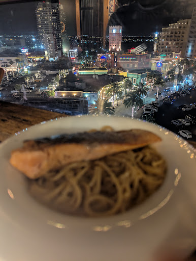 I genuinely wanted to love this place. From the moment I stepped onto the 7th floor, the view absolutely took my breath away — it's truly one of the most stunning backdrops you could ask for while dining. The staff were kind and attentive enough, around a 7/10 in terms of service, and I appreciated their professionalism throughout. The potato wedges were surprisingly excellent (9/10), and my smoked Manhattan with Blanton’s was a standout — possibly the best I’ve had in the past five years. Honestly, that cocktail alone deserves its own spotlight (10/10). Even the water was crisp and refreshing.