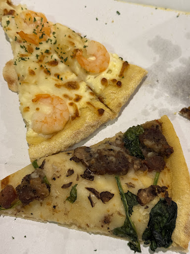 That is menu picture and actual pie. THEY NAILED IT. Super sweet and attentive staff. All male. Also delish pie except for the wasabi slices. Not because of spice, it was not hot. It was I think chicharron but not crunchy. I couldn't do it. The corn/limabean slices were AMAZING. I am still thinking about it now. 🤤🤤🤤. It was pretty quick too. We ordered 3 pies. If you are from America, note that a medium pie is the size of a personal pie. If you are feeding a family of 4 boys. Go ahead and get everyone their own large. We got plain cheese, ultra meat, and I got the featured pie and all were delish. Very affordable. All drinks are bottled. They do have super cute outdoor seating. And two 4 seater tables inside. The tables are perfectly huge. If the parking is full, give it a beat. For the hour we were eating it was mostly online orders, and to go. They do not have crushed red pepper flakes....