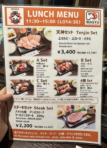 We absolutely loved the Okinawa Motobu Beef! It was one of the recommended items from the à la carte menu. The Tenjin set, which was the top item on the set menu, was also excellent. The Steak set was decent, but nothing extraordinary. I think you can gauge the quality of the food by the price; the price truly reflects the taste.