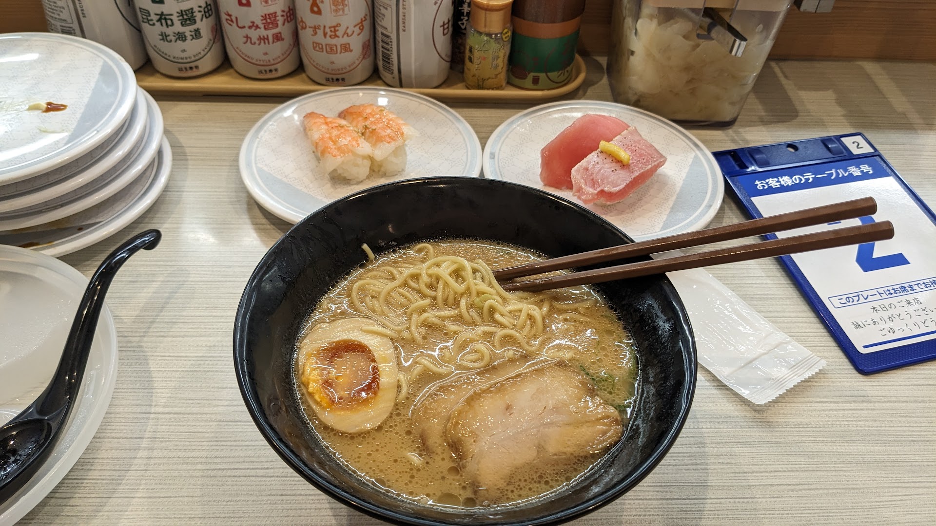 Read moreRed shrimp rare steak, shrimp with salt and sesame oil, fatty tuna with salt and sesame oil, large cut medium fatty tuna and grilled medium fatty tuna with yuzu salt and lemon, tuna marinated in soy sauce and garlic, fatty tuna with avocado and mayo, in tonkotsu ramen with char siu. I read the reviews and honestly everybody was raving about conveyor belt sushi. I figured I would give it a try and I was not disappointed. The variety, freshness, and speed with which food was delivered to me was outstanding. Luckily I went by myself so I got to sit at a counter very quickly otherwise the restaurant was very crowded for the dinner Time Rush. I would highly recommend any of the items that I ate which are listed above as they were all delicious. 10 plates in total of sushi and a large bowl of ramen was less than $17.00. I would say it was definitely worth the money and an...