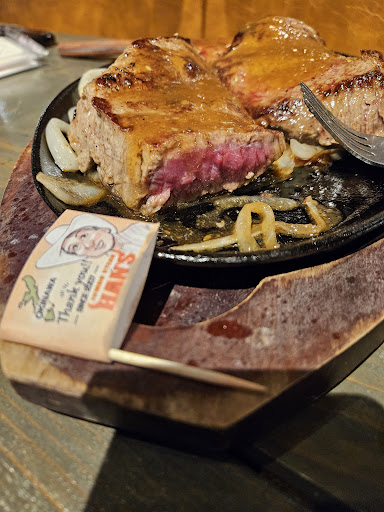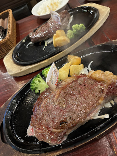 Read more4/20 週日中午門一開就去吃,吃完好像沒有其他組客人。 點了肋眼¥3938跟丁骨¥6270,肉感不錯,桌上洋蔥味醬汁很棒!沒有加點自助吧,幸好沒有,因為太飽了 —— Jumbo Steak Han's Mihama (ジャンボステーキ HAN'S 美浜店) 是沖繩一家相當知名的牛排連鎖餐廳,位於美國村 (American Village) 附近的美浜地區,因此得名。它以其大份量的牛排和相對實惠的價格而受到當地人和遊客的歡迎。