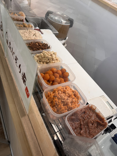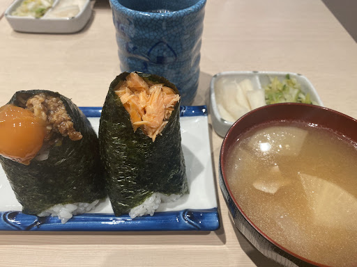 Read more某デリバリーサービスでは頼んだ事がありましたが、実店舗でも食べてみたくなり行ってみました。 少し遅い時間に通ると無くなっている具材があったので開店すぐの時間帯に行きました。 店内は決して広いとは言えず、ほとんどがカウンターの様な、おひとり様席。一応4人掛けの席もありました。 注文は1人ずつというのが「?」でしたが、とにかく注文。味噌汁とお新香も付けました。 デリバリーではこの様なちゃんとした味噌汁ではなかった記憶があるので○ お新香は至って普通のどこにでもあるやつです。 おにぎりはやや軽めの握りでほぼ確実に崩れます。 これが良いのか悪いのかは分かりませんが、ふっくら感をしっかりと感じる事が出来ます。 また具材はめちゃくちゃたっぷり入っています。 お値段はおにぎりにしたらやや高めな値段設定ですが、昨今コンビニのおにぎりも高くなっていますが、上記した具材の多さや大きさを考えたら○ 星を1つ減らしたのは女性店員(握ってくれた方)の接客が悪いのと、個別に注文する謎システムが理解出...