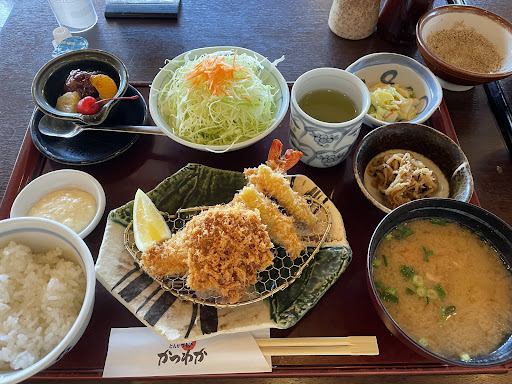 入店前、お店前のメニュー写真を見て決めた、レディース膳。 あんみつも付いて、ドリンクも付いてとなると、選びお食事は、即決まりです。 お食事が運ばれる前に、お茶と共に、ごますり用の小さいすり鉢が来るのは、ごりごり時間もあり、嬉しいですね。 揚げたてのヒレカツにエビフライ、アスパラガスのフライのAを選びました。セット内容が異なるBCとありました。 ご飯は、時間帯的にか、選択肢なく、白米のみ、古代米の案内はありませんでした(ちょっと残念) 味噌汁、豚汁とわかめ汁、私は、豚汁を選びました。 ヒレカツは、揚げ具合もちょうど良く、美味しかったですが、エビフライは、どこかいまひとつ…。 しかしながら、お野菜のたっぷり入った豚汁は、嬉しい事この上ありません。 あんみつも量的にちょうど良いです。 支払いは、現金かクレジットカードだけですが、還元率の良いポイントカードは、1000円毎に、スタンプが付き、なんとカードいっぱいになると、1000円の割引があるそうです。