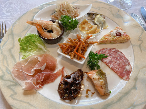 前菜盛り合わせ、パン、パスタorスープ、メイン肉&魚、デザート3種盛り合わせ、コーヒー、 ワインもいただき、初回の割引特典で2人で10,000円しないくらい。