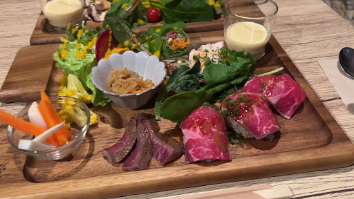 ランチプレート2000円を注文しましたが、大きな木のプレートにモリモリの野菜と、生春巻き、しっとりと柔らかい蒸し鶏、赤みが口の中でとろける肉寿司と レアステーキ。思わずほっぺた抑えちゃうくらい美味しかったです!プリンも滑らかで優しい甘さでちょうど良い量でした☺️