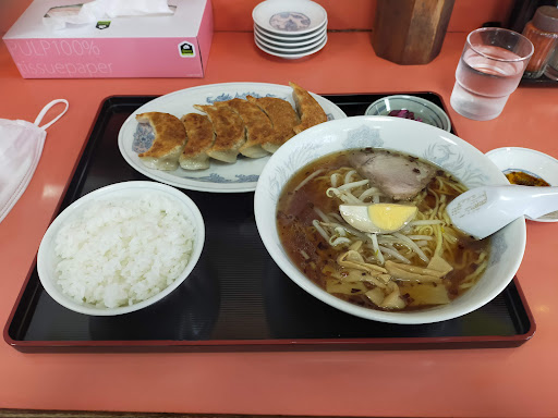 Read moreニンニクたっぷりの餃子。 ロイヤルホームセンターに立ち寄った際に向かいの中華屋へ。 看板は家系ぽいが中に入ると昔ながらの町中華。目立つデカい餃子の看板があったから餃子が名物だろうと思い餃子セット(餃子、ラーメン、半ライス)950円を頼む。 それ程待たずに運ばれる。餃子はカリッと揚げ気味に焼かれている。何も付けずに一口。ニンニクがガツン。肉汁はなく弾力系。モチモチの皮にカリカリの焼き、ニンニクの強い弾力のある餡。肉汁系に慣れた口には、懐かしい味。 ラーメンは焦がしネギがアクセント。若干、豚骨系以外の味も混じる。昔ながらの中華麺とは少し違う。器は小さ目だが麺がたっぷり。 ランチもいいが、餃子でビールがあっている店かな〜と思い...