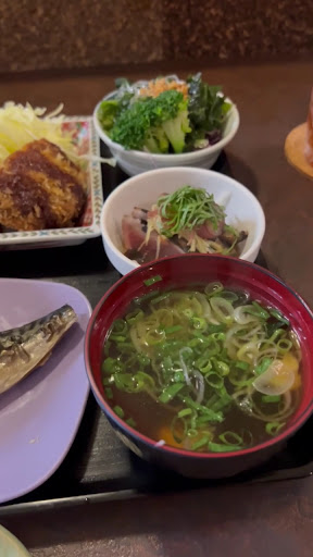 肝心のお味は・・・ お吸い物は出汁が効いてて若干濃いけど嫌いじゃない。 サラダは新鮮とは言えないけどなかなかギッシリ。味は普通。 鰹のたたきは生臭さもなく、美味い。コレが1番うまかったな。 鯖の塩焼きは冷凍か?または焼きすぎなのか?少しパサついててジューシーさが欲しい。 うどんはおそらくつゆは既製品のタレを薄めたやつ。 細目でかなり柔かったから乾麺なのかも。不味くはないが特別うまいわけでもない。 麻婆豆腐は普通に美味しい。もっと辛みが欲しいかな。 メンチカツはおそらく業務用の冷凍品じゃないかな。