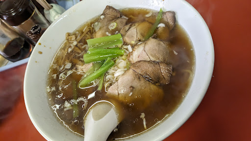 昭和の町中華を具現化したお店。 街道沿いのためお店の専用駐車場などは用意されていないので、千葉から向かうなら手前側にある駐車場に車を停め、街道沿いの2つ離れたお店へ。 自身あまり町中華巡りはしていないので、一瞬入店に躊躇するも、「ごめんください」と赤い暖簾をくぐる。 と、常連さん3組がテーブルに腰掛け、店員おばちゃんたちと盛り上がっている。 まるでドラマのような地元密着のお店何だなぁと思いつつもカウンターへ 何をか言わんや食べようかメニュー表を見て、衝撃を受ける。 ラーメン550円、チャーハン550円、餃子300円、一番高いメニューでもエビのからし炒め850円……タイムスリップ感半端ない。 常連さんとの会話が少し収まったのを見計らってチャーハンと餃子とチャーシュー麺(700円)を注文する。 眼の前でマスターが動き出し、何十年も繰り返した手際よい動きで調理を始める。 オ待つこと五分ほどでラーメン、そして餃子が出てくる。 麺は中太縮れ麺に加水率高めで、ツルッとした喉越し。 チャーシューは専門家ではないのでよくわからないけれど歯ごたえのある少し小さめのもの5、6枚で、甘すぎず全体のバランスを崩さない控えめの味付け。少し遠くに八角を感じる。 他のトッピングはメンマ・ネギ・小松菜?と見た目で、コレ昭和の頃に食べたなぁと懐かしくなる。 餃子は大きめのものが6個で提供されるが、少し合わせが弱いので一口で頂くことをおすすめする。 最後のチャーハン、コレがまた絶品!生涯食べた中でベストスリーには入るとおもう。この味を表すのは他のレビューアーにおまかせする。 そしてすっかり忘れていたけれど、おまけの一品として、たまごスープが登場! 一瞬、「頼んでないけど」と思いつつも、あーコレがおまけか?と気づき、「すみませんありがとうございますー」とお礼を言って頂く。(上記二人でシェアしながら頂いた点に注意されたし) 会計は1550円でやはりたまごスープはサービスだった(いいのか?) 炭水化物を多量摂取で眠気に襲われつつも駐車場で精算(100円でした)し千葉市...