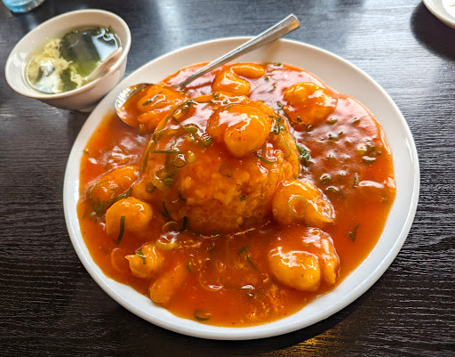 中でも、とっても人気なのが「エビチリあんかけチャーハン」です。多くのお客さんがこれを注文しています。餡たっぷりのエビチリがどどーんっとチャーハンの上に乗っています。