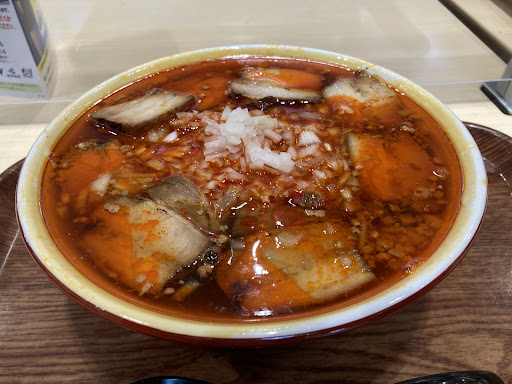 PASAR幕張上りのフードコートにあるラーメン店に初訪問。 こちらのお店は下総タンタンメンと竹岡式醤油ラーメンの両方が販売している変わったラインナップ。ともに千葉県を代表するラーメンですが、中身は全然違いますが。 下総タンタンメンは、どうやら辣油をスープのベースとなっている勝浦タンタンメンをイメージしているようですが、勝浦という地区はもともと下総国ではありません。 そもそも、千葉県は3つの旧国が合併して出来た県ですが、勝浦は上総国と安房国の境にある上総国側の地区です。 全然関係のない下総の名前を冠することで、本家と味が似つかわしくないというクレームから、逃げ仰る気なのでしょうか。 それに対して、竹岡式として正々堂々と名前をつけるあたりに、お店の自信が窺えます。 竹岡式と言えば、刻み玉葱が鮮やかにトッピングされ、醤油ダレの濃い味付け、乾麺を使い、その茹で汁をスープとして食する独特な製法が有名ですよね。 期待して待つこと2分で、店員さんから大声で呼ばれます。あれ?乾麺にしては早すぎない?嫌な予感。 なお、見た目の濃い黒いスープは、確かに竹岡式っぽい。 スープをひと啜り。醤油が引き立った竹岡式のイメージ通りでグーです。チャーシューは小さいながらも、柔らかくて美味しいものが3枚あり、玉葱のシャキシャキした食感と濃い醤油スープと良く合うバランスの良いものでした。 ただし、こちらのラーメンの最大の弱点は、麺でした。乾麺使っています?茹で加減も柔らかくて、一口目から早くも伸びていない?大盛とか頼まなくて大正解の味わい。 千葉県で楽しい時間を過ごし、帰路に向かう途中の最後に、こちらで美味しい竹岡式醤油ラーメンの思い出を上書きしようとする方々に対して、奈落の底に落とすような存在になっていませんでしょうか? 麺を変えるだけで、大分印象も変わると思いますが、下総タンタンメンの存在により、変更することは難しそうですかね。 結局、事故に...