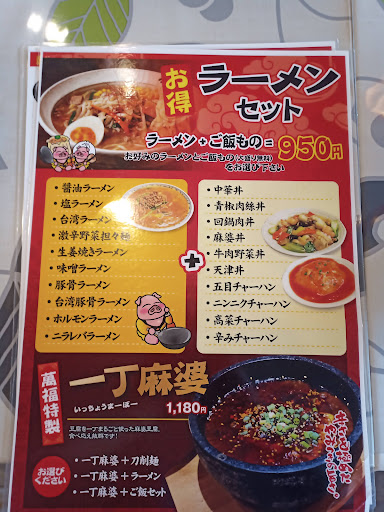 Read more萬福で満腹。味も満足。腹ペコで見るからに盛りの良さそうな中華屋へ。駐車場も広く訪れやすい。 店に入ると元気な店員さん。中国語が飛び交ってる。席に座ってメニューをみる。ランチは定食600円からラーメンセット950円までと色々。目に止まった激辛野菜担々麺に五目炒飯のラーメンセットを頼む。 店内は楽しげな装飾。奥には電子タバコ専用の部屋もある。 直ぐに運ばれる。激辛野菜担々麺を見てびっくり。普通の担々麺ではない。スープはしっかりとゴマの香りがするが粘度は低め。辛味は激辛まではいかないが程よい。定番の挽き肉だけでなく野菜もたっぷり。パプリカも入っていて彩りもいい。担々麺✕タンメンと言った感じ。初めての担々麺。量は普通のラーメン屋の大盛りはある。 炒飯はパラパラ。この手の店の提供は早くてもベッチャリとしている事もあるが、一線を画している。セットの炒飯とは思えない。野菜担々麺との組み合わせは正解。旨いな〜。 すっかり満腹満足。 運ばれている他の料理も旨そう。再訪...