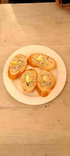 Shortly after placing an order, the waitress served a complimentary dish, which is available after 5:00p.m. (bread with noodle fish and a small slice of lemon). The noodle fish complemented the bread, with drops of refreshing lemon juices dripping onto your taste buds, providing a mouthful of sour plus slightly sweet taste.