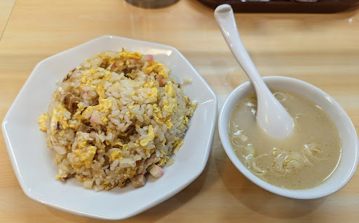 ラーメンと同じとんこつスープの付いてくるチャーハンも人気で、ラーメンに半チャーハンを付けて...