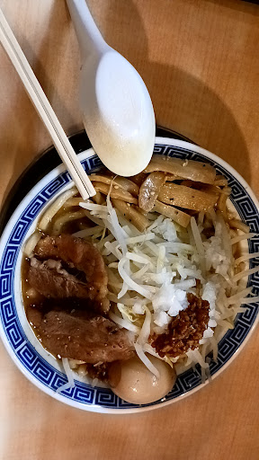 麺は極太ちぢれ麺。味は辛めがスタンダードで、普通の濃さで食べたい場合は薄めを頼んだ方が良い。 甘じょっぱい醤油味の汁に歯応えのある麺をワシワシ食べたい人は多分大好き。 特にチャーシューは厚切りで粗挽き胡椒が効いていて、盛り付ける前にフライパンでたれを絡めて焼いてくれるので温かく、個人的には最高に好き。(汁に浸けると胡椒が落ちるので、なるべく汁に浸けず、一口食べてから蓮華で汁を啜るのがオススメ) 野菜マシはラーメンの器に別盛りされるほど多い(多いので大丈夫かと聞かれる)ので自信がある人のみ推奨。(野菜マシの器にチャーシューを避難出来るので、沢山食べる人なら後記の内容も含めて野菜マシがオススメ。)