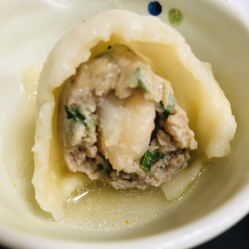 海鲜饺子🥟!在吃之前老板就很推荐我们试一下海鲜饺子。听老板说每一个有50克左右而且里面有一个完整的虾仁!还有就是饺子是灌汤的!并且是老板娘秘制的灌汤!不同于外面所吃到的那种“商业化”的皮冻之类的!品尝之后发现这个饺子真的是实至名归,鲜美多汁,个头很大!非常值得一试!(如果很喜欢的话还可以买冷冻的哦自己回家煮)