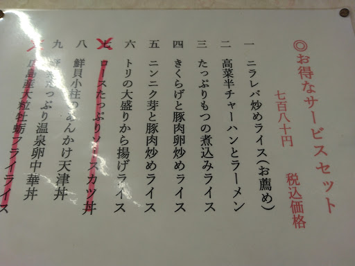 Read more千葉県、レバニラ定食で検索 ヒット⤴️⤴️⤴️ ビジュアルはアップした写真通りです。 12:00頃店前到着。駐車場は無い。126号方面から左折信号🚥 2つ目の角に店は在ります。 信号🚥で止まるとブロック塀に 有料駐車場の看板が有り左折 300メートル位直進右側に在りました。車を停めてお店へgo 早速入店。お目当てのレバニラ定食ご飯大盛りをオーダー 5分程で着丼❗ 潔い程のニラとレバー素晴らしい。最近もやしでかさ増しして レバーが見えない定食が主流だがこのお店は違った‼️ 味は少し濃いめだがレバーの嫌な臭みなどはまったく感じ無い 私的には美味しいと思います。 大盛りのご飯がみるみる無くなります。ご飯を大盛りにしてさも930円 コ・ス・パも最高!⤴️ 2回目の訪問今度はらーめんと 高菜炒飯定食780円を注文。 提供スピードは早く気持ちいい 高菜炒飯を一口、口に運ぶ高菜の風味が口一杯に広がる。美味 い高菜本来の味を消さない絶妙な塩味。らーめんは王道のザ昭和の醤油らーめん。ほっこりする味。具のチャーシューがたまらなく美味い⤴️これで780円安い。提供された際メニューの事を聞いた。写真に載っている冷やし中華などのメニューは、今は提供してなくて780円のメニューだけだそうです。残念‼️ 780円のメニューを制覇したいと思う。 住宅街に在るのに駐車場が無い事が残念‼️ 食事も趣も素晴らしい中華屋さん見つけ大満...