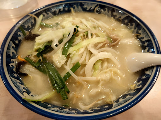 そして運ばれてきました ここのタンメンは 透き通った感じのスープではなく 白濁してる物でした まずスープをレンゲで一口 とても熱々です これは良いことです が! ん~~薄っ 味が薄い… 濃すぎるのも困るが 薄すぎると食欲が落ちる スープを一口飲んだだけで 食べ切れるかな…と不安になる それとタンメンだけあって 野菜は沢山です 味が薄いから困る 麺はちぢれの細麺 シコシコしてる感じで 味をまとっていたなら 美味しいと思う